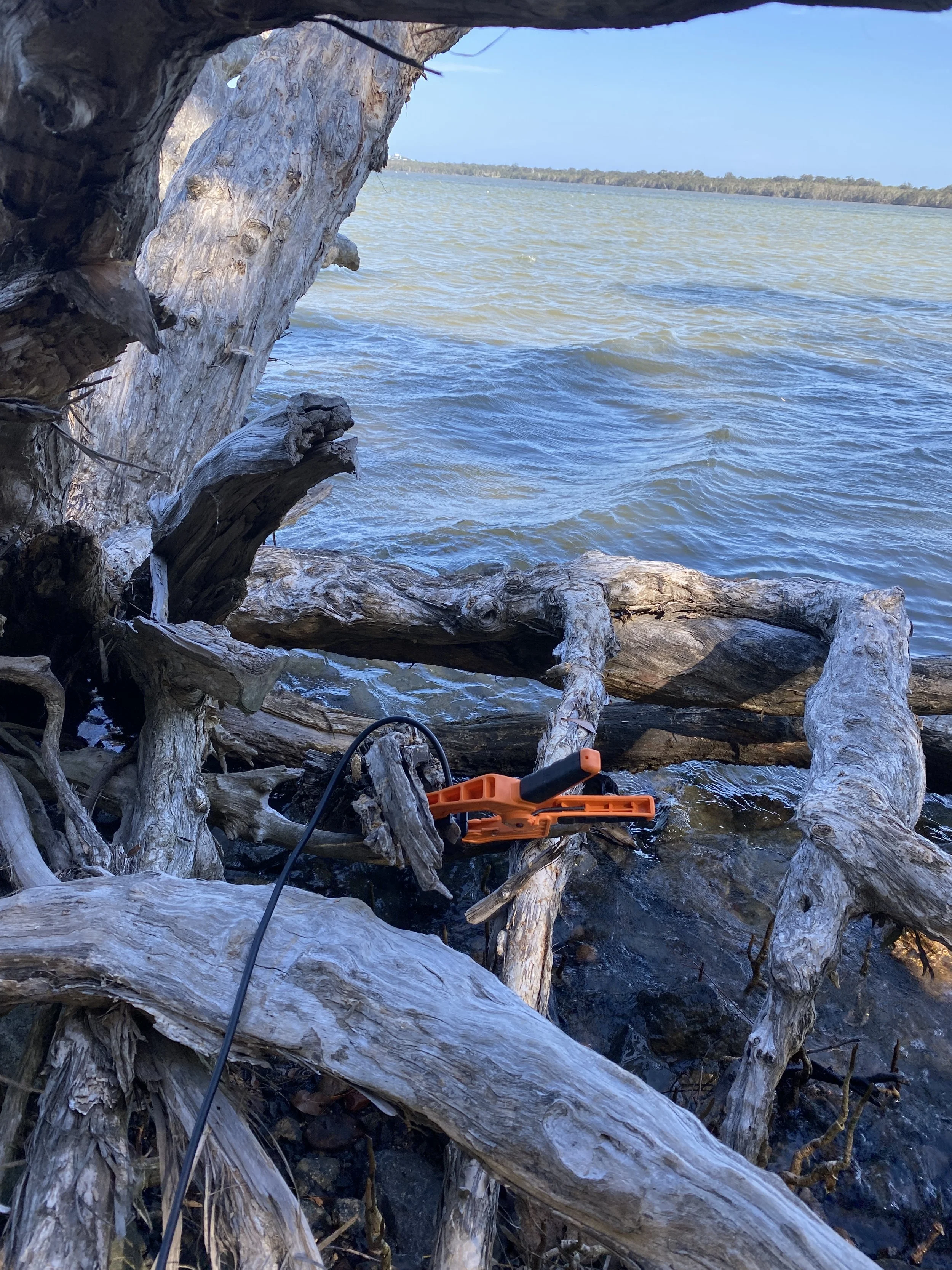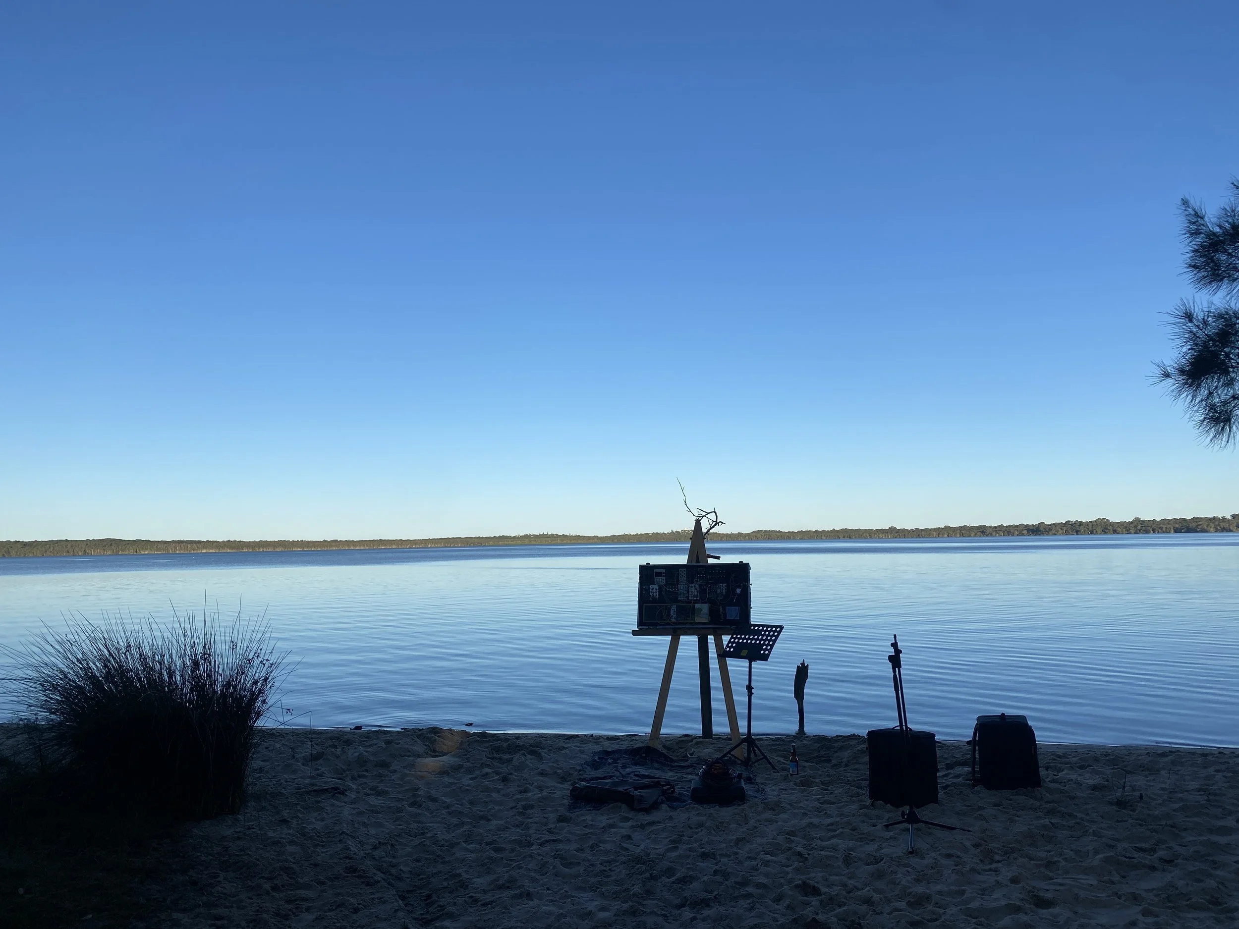 Today, I conducted an on-site rehearsal session on the shore of Lake Weyba, a similar lake, though smaller in size, to the northern Lake Cootharaba. On a quaint little patch of sand at the water’s edge, I set up my modular synthesizer, power station, and battery speakers, with a field kit of contact microphones, a stereo hydrophone, and a Zoom H4.