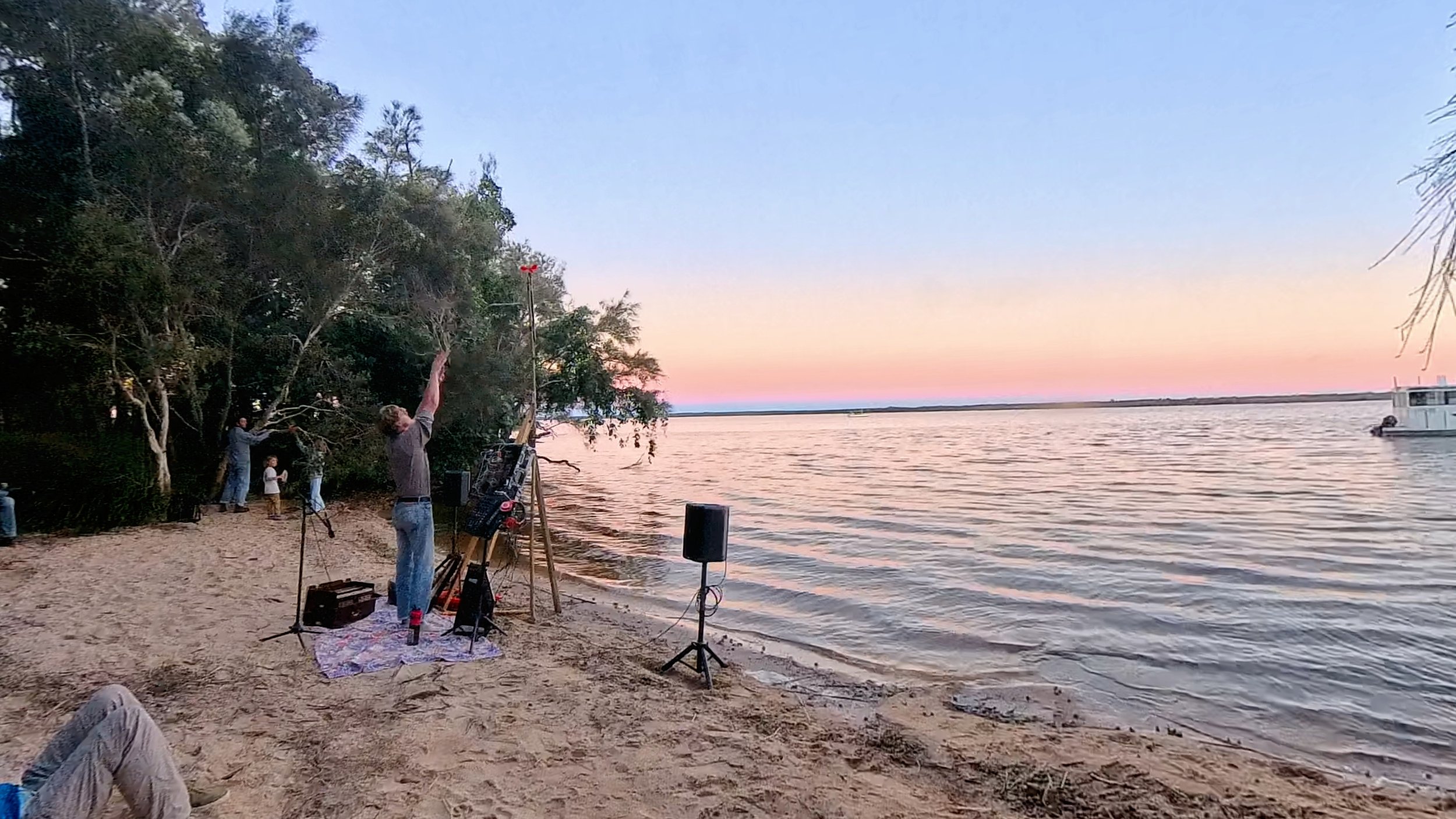 This time, the I delivered my performance a little further south on the lake, at Boreen Point. Boreen Point is more accessible, with a road that runs along the foreshore, with houses and a yacht club opposite the lake. The road passes several small beaches and a park before heading into the local campground. I performed on the last small sand cove before the campground, where a short wall of rocks and a bench provided ample seating for the audience. The area is a little more lived-in than the pristine Elanda Point; I cleaned up a handful of cigarette butts in the sand and wafts of beer spilled somewhere meandered through the air. The view of the lake included a few anchored boats looking worse for wear. Regardless, this was still a special spot for me; this is where I would often come on my breaks while working at the Apollonian Hotel up the road in 2022. I arrived early and took my time setting up while groups of Floating Land attendees wandered up and down the road for a range of activations by the festival, including artist talks and a Tree Interview Walk led by Fiona Harding. I briefly joined Fiona’s tree walk and was given the opportunity to impersonate a great, big, gnarled paperbark on the neighboring beach. I recreated the sounds I have heard in paperbarks throughout this project - deep ‘klok’ and clicking sounds, immersed in swishing waves - Fiona was surprised at how close this was to the voices she had heard the trees speak in!