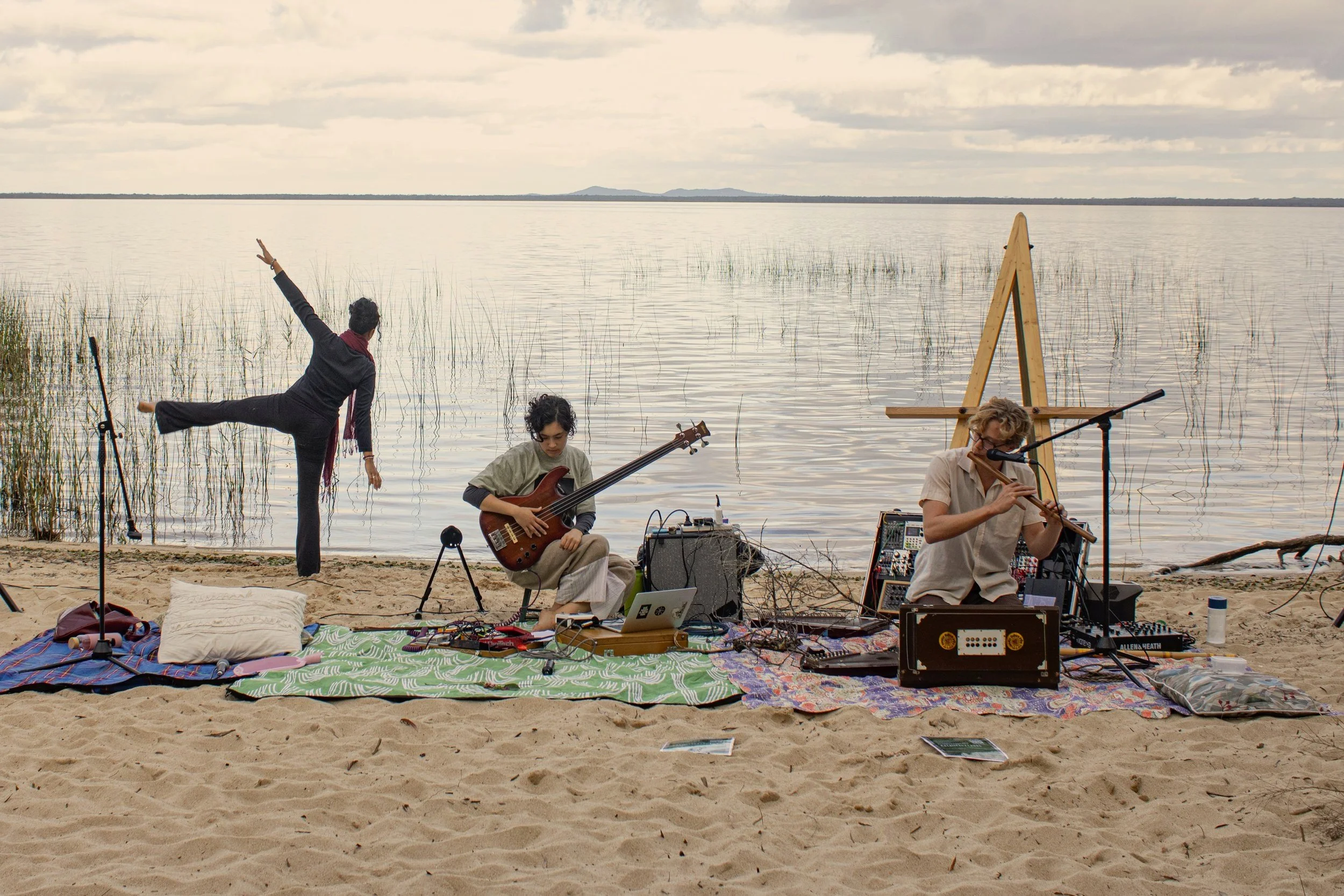 We arrived at the lake and arranged our equipment at the water’s edge, in a small cutting of beach between groves of grass and gums. Laid out on two mats were two zithers, a harmonium, Julia’s bass and amp, my two flutes, two mics, and my modular synthesizer leaned up against the easel. I had the others help me gather some suitable sticks to apply my clip-contact mic to, which I fed into my Resonator module. We were to play seated, or kneeling, on the mats. My battery PA stood wide, at the rear corners of our performance space, allowing us to hear the master mix. I accounted for feedback by facing the mics outwards, which also allowed Sachi and I to face inwards from the left and right sides respectively, with Julia facing the audience in the centre. There was a lot to set up - I had a new ADAT interface and my laptop behind the synth to multitrack record the performance, cables had to be run, field recorders and an Insta360 camera had to be set up to record documentation. I opened a field kit case to see my newly glued-back-together wind sensor again shattered… The mindfulness I had cultivated in the morning was proving tough to maintain. In my rush, I forgot to pin up the posters directing people to leave voicemails as survey data. I threw these onto the sand between us and the audience fifteen minutes into the performance, Toby helped by picking them up and distributing them.