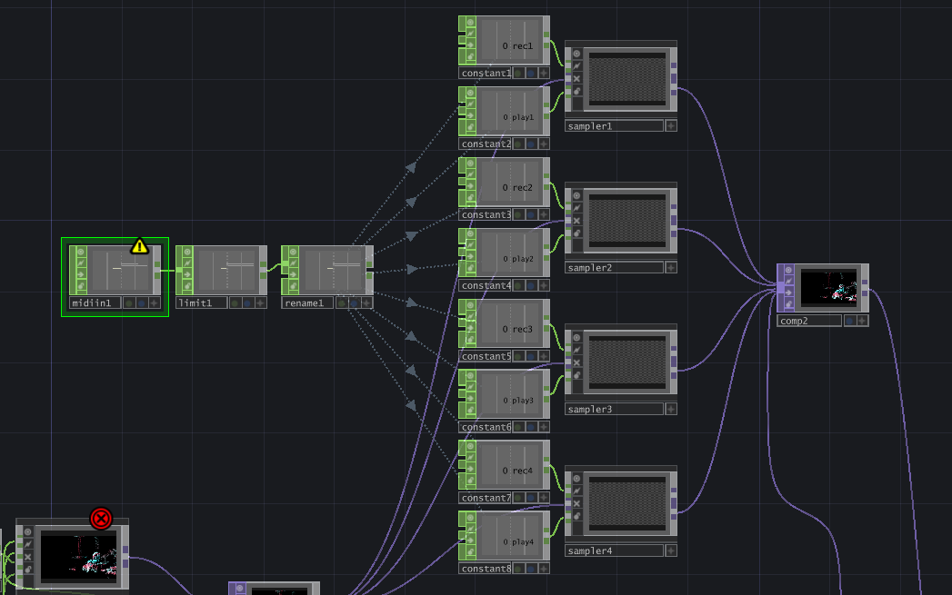 Four sampler components with MIDI routing in and video outputs combined in a Composite TOP.